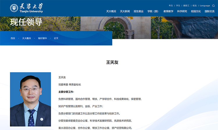 近日,天津大學官網“現任領導”一欄更新顯示,王天友已任天津大學常務副校長。