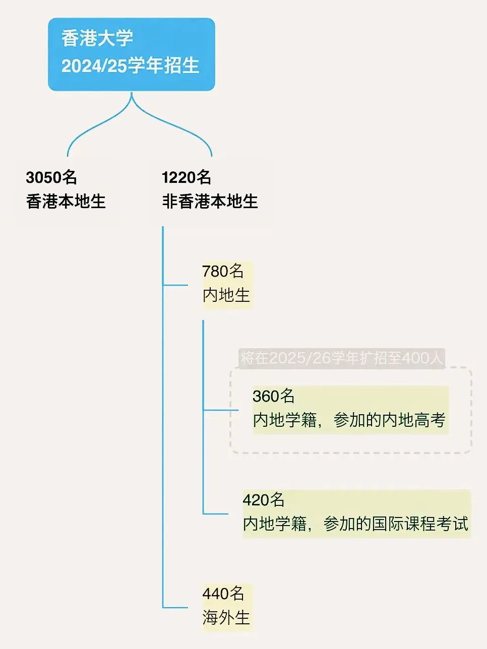 值得特別關注的是,日前,香港大學明確2025/26學年將繼續擴招。港大計劃在2025/26學年將「內地高考生」的錄取名額增加至400人。