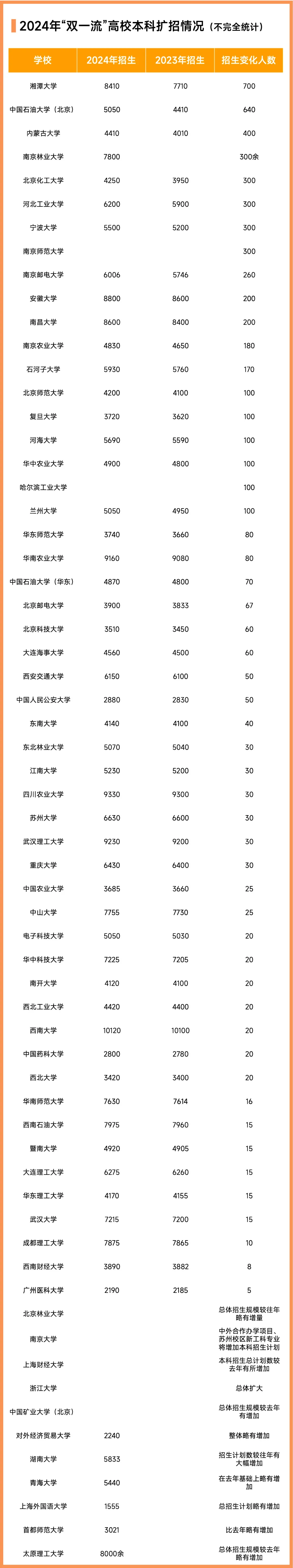 據統計數據,湘潭大學、中國石油大學(北京)克拉瑪依校區、內蒙古大學、南京林業大學、北京化工大學等超60所“雙一流”均增加了招生名額。其中,新晉“雙一流”建設高校湘潭大學,2024年招生計劃8410人,相比2023年擴招了700人,中國石油大學(北京)克拉瑪依校區增加640人,內蒙古大學則增加了400個招生計劃。