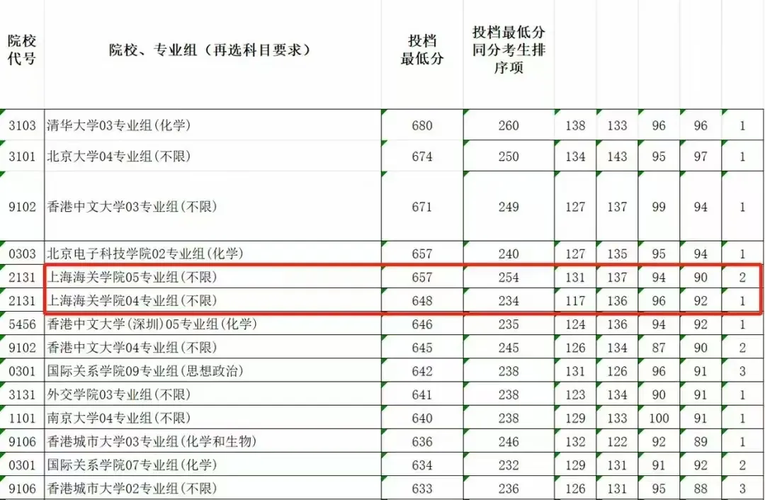 北京電子科技學院(02專業組化學)、上海海關學院(05專業組不限)的投檔線雙雙定格在657分。這個分數在提前批高校中僅次于清北、香港中文大學、國防科技大學,甚至超過了復旦、南大、上交、同濟等一眾頂尖985名校。