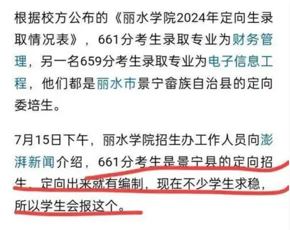麗水學院招生辦老師揭開謎底:“這是定向委培生,畢業就帶編制。現在學生和家長都求穩,所以愿意報。”同年還有位659分考生,選了該校電子信息工程,同樣是定向培養——兩人都來自麗水市景寧畬族自治縣。
