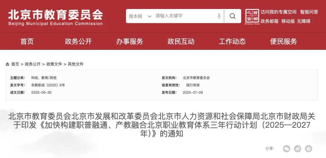 7月9日,北京市教育委員會網站發布《加快構建職普融通、產教融合北京職業教育體系三年行動計劃(2025—2027年)》,其中明確提出:支持高水平高校與職業院校探索高職專科、職業本科、專業碩士貫通培養高水平技能人才。