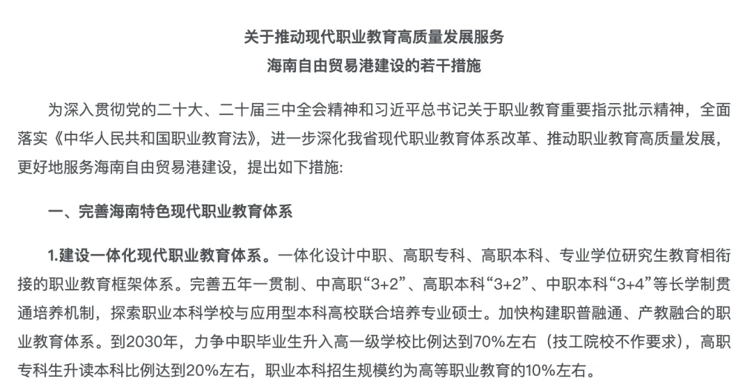 今年4月,海南省人民政府辦公廳印發的《關于推動現代職業教育高質量發展服務海南自由貿易港建設的若干措施》中明確指出:建設一體化現代職業教育體系。一體化設計中職、高職專科、高職本科、專業學位研究生教育相銜接的職業教育框架體系。探索職業本科學校與應用型本科高校聯合培養專業碩士。
