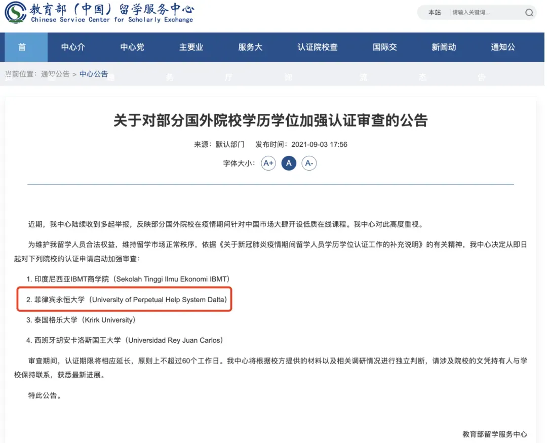 2021年9月3日,教育部(中國)留學服務中心網站發布《關于對部分國外院校學歷學位加強認證審查的公告》,菲律賓永恒大學(University of Perpetual Help System Dalta)就在名單中。