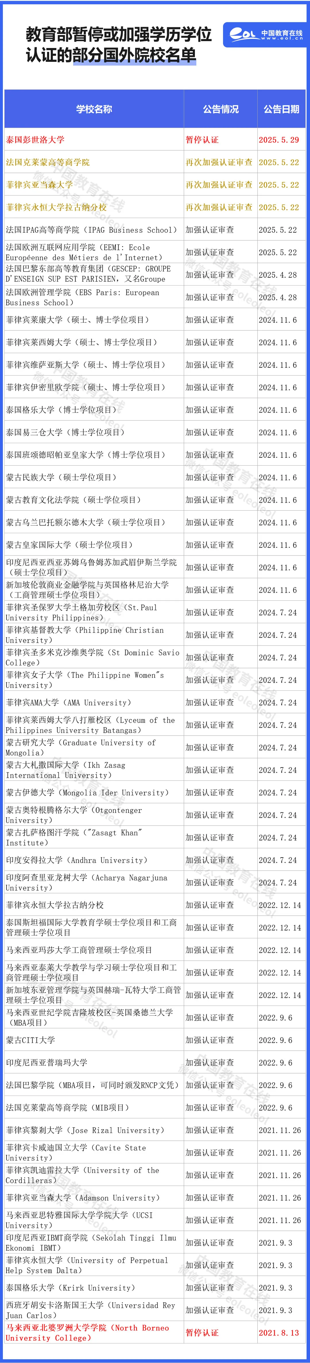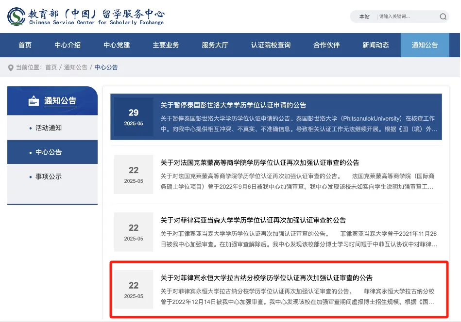 2025年5月22日,教育部留學服務中心發布多條關于海外高校學歷學位認證再次加強認證審查的公告,其中就包括菲律賓永恒大學拉古納分校。