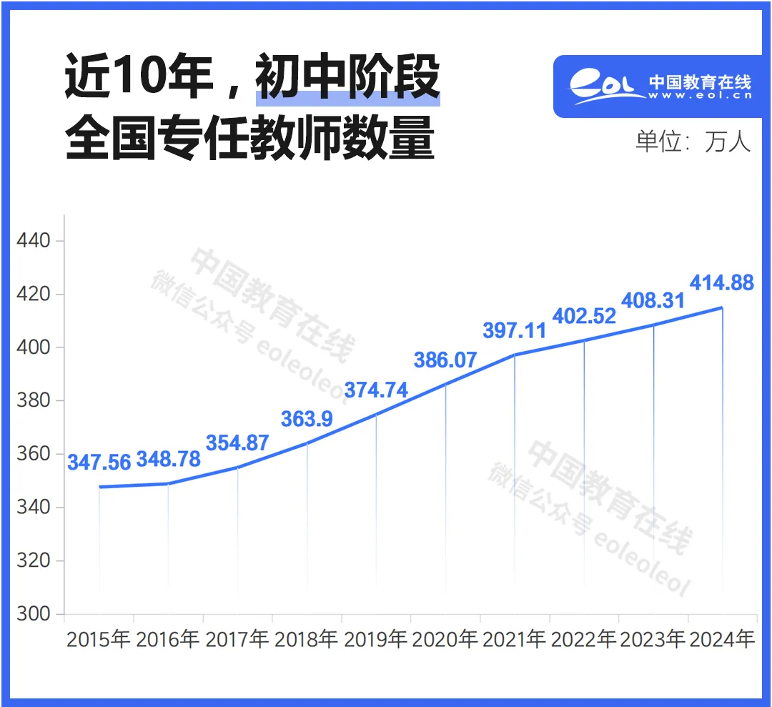 十年來,我國初中專任教師總數持續上漲。從2015年的347.56萬,至2024年的414.88萬,初中教師總數增加了67萬人。
