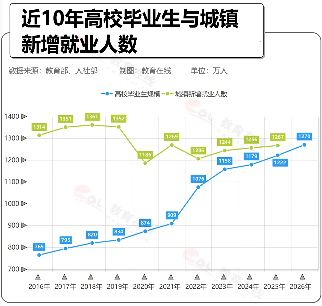 據教育部公開數據,2026屆高校畢業生規模預計1270萬人,同比增加48萬人,再次創下歷史新高。