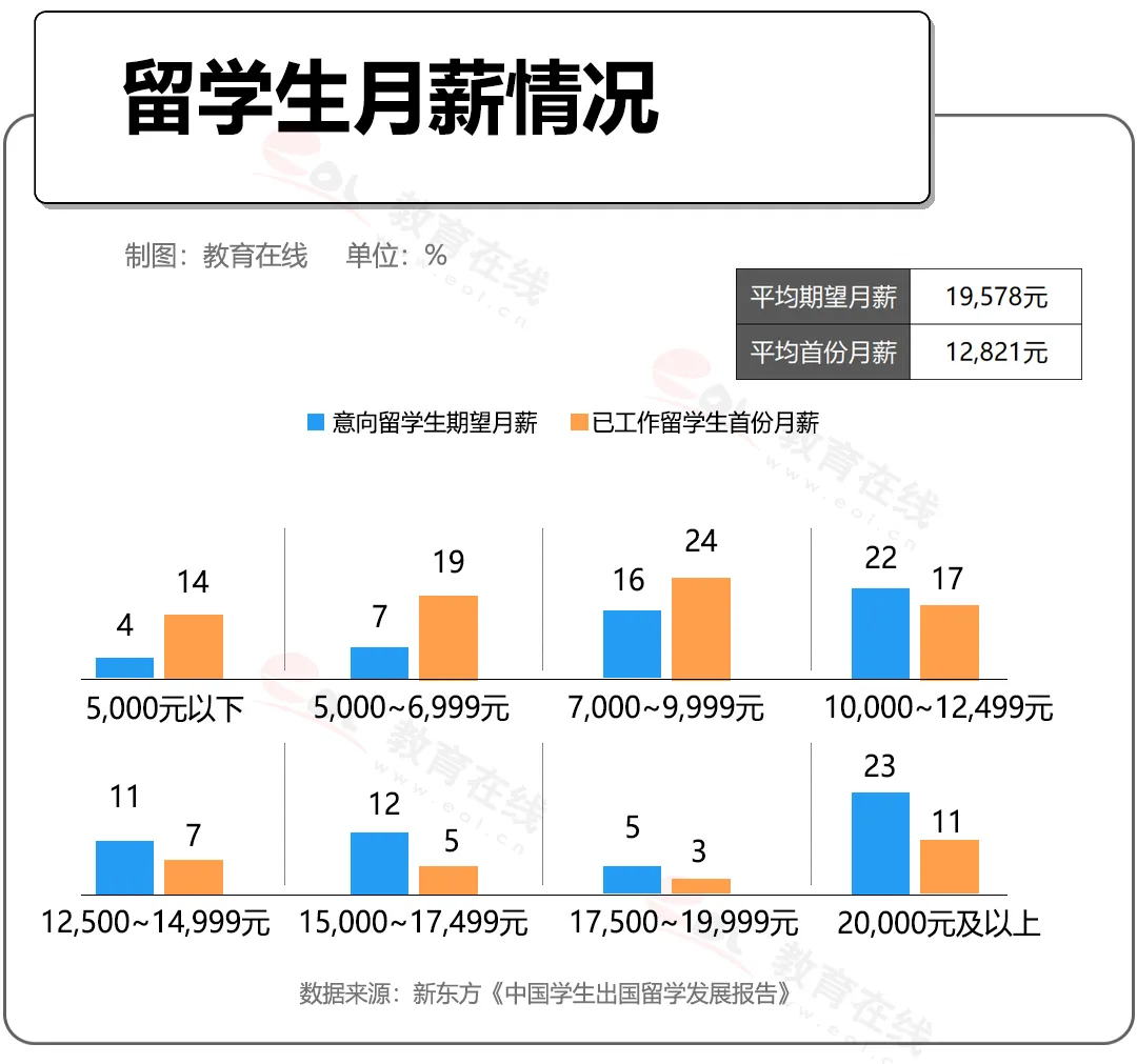 根據報告,留學生期望月薪主要集中在20000元及以上(占比23%)和10000-12499元(占比22%),顯示出較高的心理預期。
