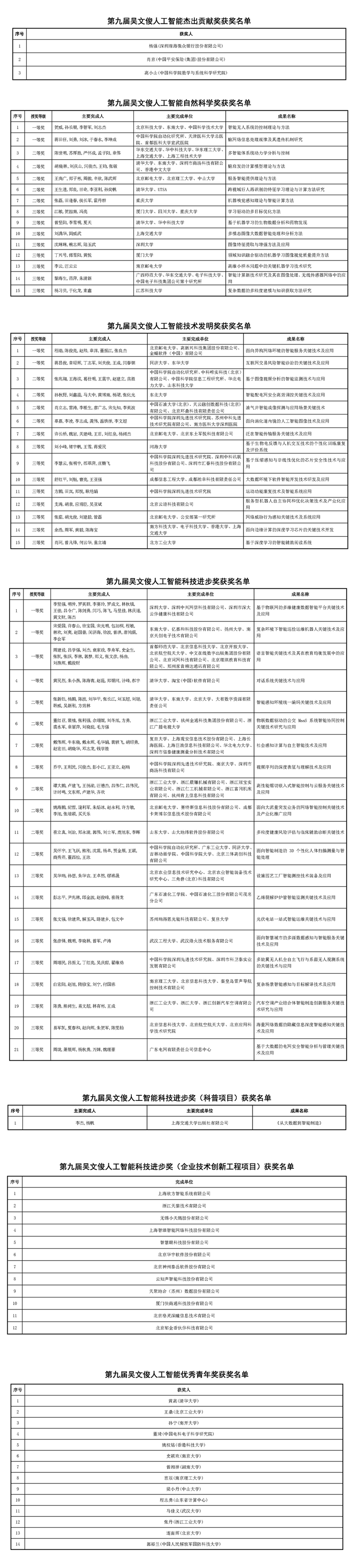 經吳文俊人工智能科學技術獎勵委員會審核同意,報中國人工智能學會理事長批準,現將第九屆吳文俊人工智能科學技術獎獲獎名單在中國人工智能學會官網(www.caai.cn)、吳文俊人工智能科學技術獎官網(www.wuwenjunkejijiang.cn)進行公示,接受社會監督。自公示之日起2019年10月11日—20日為異議期。在此期間,任何單位和個人對獲獎成果內容的真實性持有異議,請以實名并書面形式向吳文俊人工智能科學技術獎辦公室提出意見和證明材料,凡匿名和超出規定時間的異議不予受理。