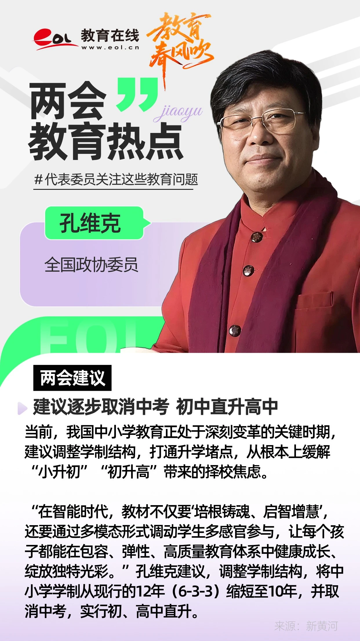 “在現有的學制下,為了小升初、初升高,很多初中,甚至高中的知識都壓到了小學階段,小學生理解不了,還極大增加了心理壓力。”孔維克建議,調整學制結構,將中小學學制從現行的12年(6-3-3)縮短至10年,并取消中考,實行初、高中直升。