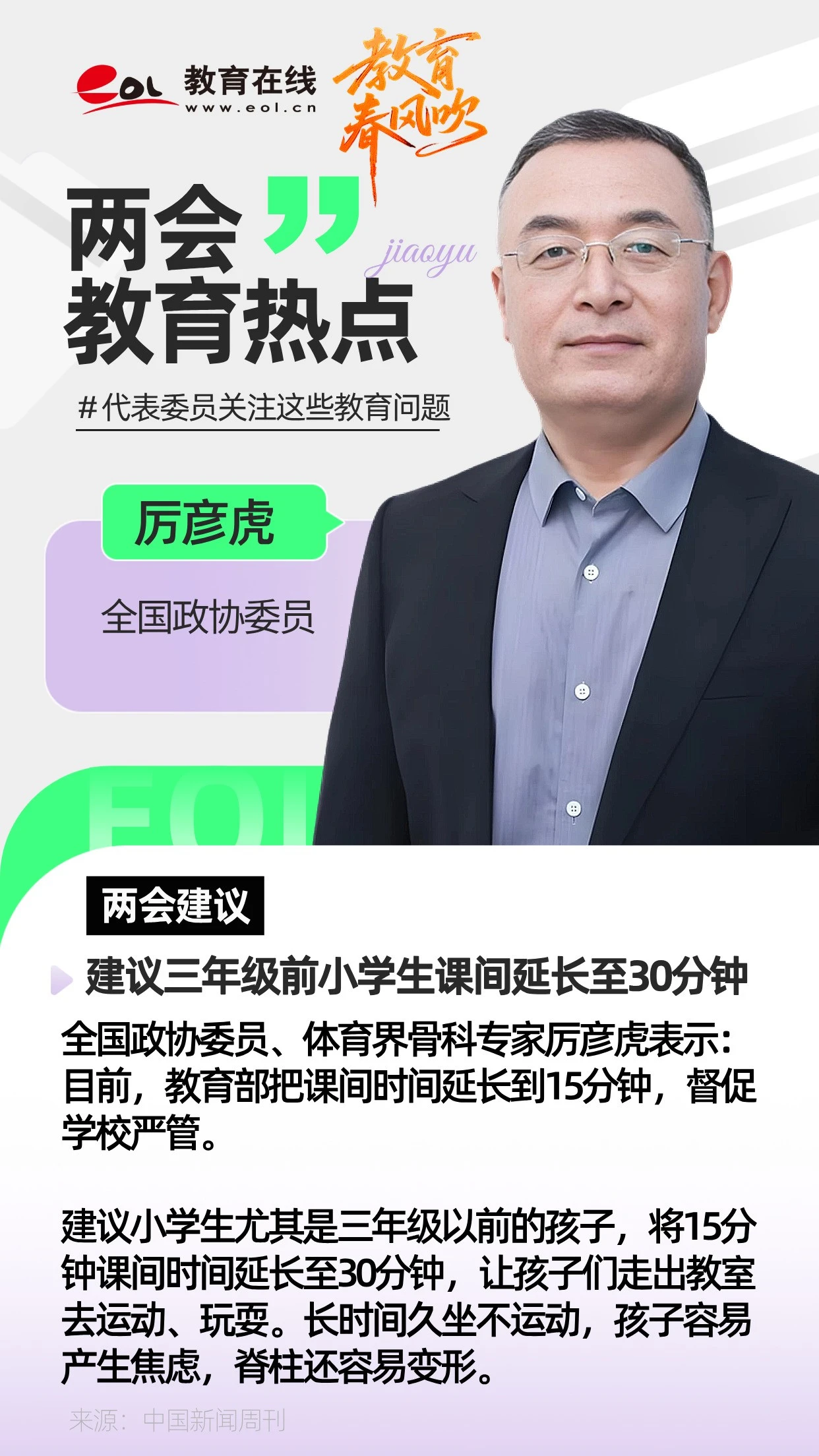 厲彥虎:建議三年級前小學生課間延長至30分鐘