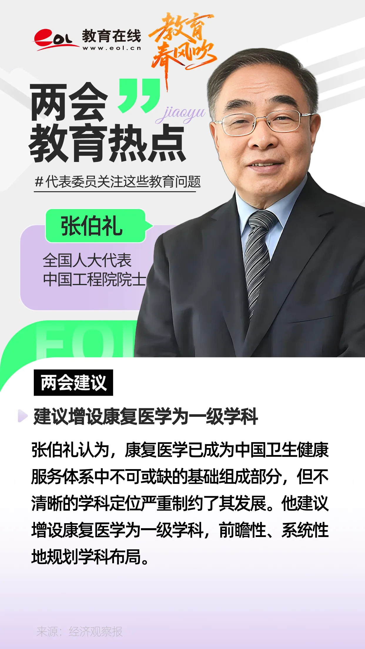 康復醫學已成為中國衛生健康服務體系中不可或缺的基礎組成部分,但不清晰的學科定位嚴重制約了其發展。中國工程院院士張伯禮建議增設康復醫學為一級學科,前瞻性、系統性地規劃學科布局。