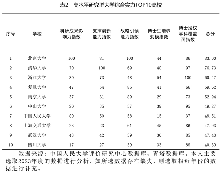 高水平研究型大學綜合得分排名前10的高校是北京大學、清華大學、浙江大學、復旦大學、南京大學、中山大學、中國人民大學、上海交通大學、武漢大學、四川大學(見表2)。從各大學在不同維度的表現來看,北京大學以83.00的總分位居榜首,在戰略引領能力和科研成果影響力兩個維度均獲100分,凸顯出北京大學在科研領域的卓越實力和持續創新能力。清華大學以76.73分緊隨其后,在支撐創新能力表現最佳(100分),憑借高端先進的科研設施和高效協同的創新平臺搭建能力,為高難度、突破性科研項目提供了堅實支撐。浙江大學以60.47分的綜合得分位列第三,學科覆蓋面得分為100分,說明學科門類較為齊全,反映出該校在學科布局的廣度和深度方面表現出色,為多學科交叉融合、知識創新與科技突破奠定了良好的基礎。需要指出的是,博士培養規模得分最高的是中國科學院大學,這所以科教融合模式為特點的大學源于中國科學院研究生院,2012年更名為中國科學院大學。在招生培養方面,中國科學院博士生招生歸口中國科學院大學,但培養過程主要在各下屬院所進行,使得學生能夠直接參與高水平的科研項目[31]。2023年,中國科學院大學博士生招生人數將近8000人,是位列第二的浙江大學的兩倍。