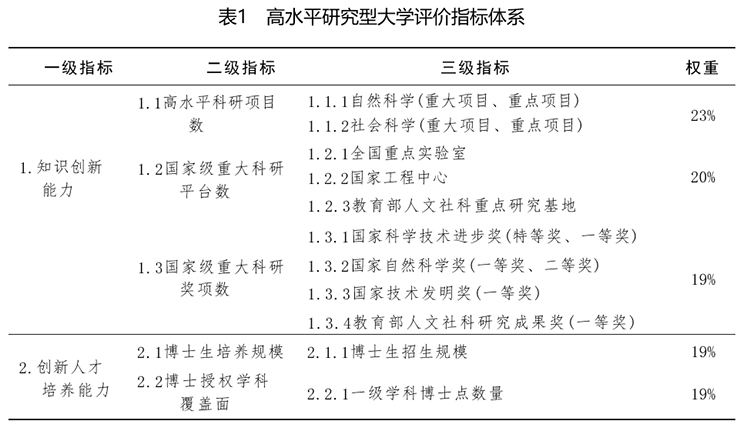 為了科學、自主地確定高水平研究型大學的評價標準,本文選取評價指標遵循如下原則。一是本土化原則。從概念模型出發,高水平研究型大學是一個中國式概念,因此指標選取應充分考慮中國的國情與發展的需要,選取能夠反映新型舉國體制下高水平研究型大學服務國家重大需求、培養高層次人才與服務社會的重要指標。二是科學性原則,在指標的選取中突出關鍵指標和核心特征,能夠科學準確地反映高水平研究型大學的核心特征和建設目標。每個重要領域應選擇最具代表性的指標,避免指標過多導致信息冗余。三是數據可采集原則,指標數據應具有可獲取性和準確性,確保數據來源可靠、測算科學合理。