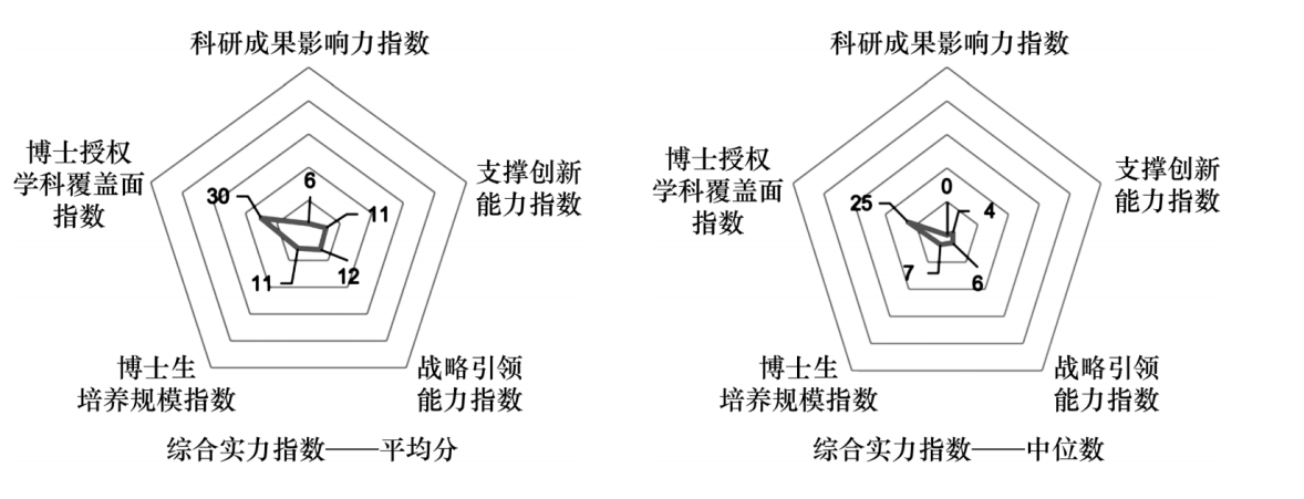 能力兩個方面均有出色表現,但大部分重點高校表現一般。與北京大學相比(圖2),全國重點大學(平均分)雷達圖面積要小得多(圖3左)。北京大學的戰略引領能力指數、支撐創新能力指數、科研成果影響力指數、博士生培養規模指數、博士授權學科覆蓋面指數分別為100分、81分、100分、44分、86分;全國重點大學相應指數的平均分分別為12分、11分、6分、11分、30分,如果用中位數(圖3右)則分別為6分、4分、0分、7分、25分,差距更大。這反映出中國重點大學大部分尚不具備高水平研究型大學的特點,建設一批高水平研究型大學是第三輪“雙一流”建設的首要任務。