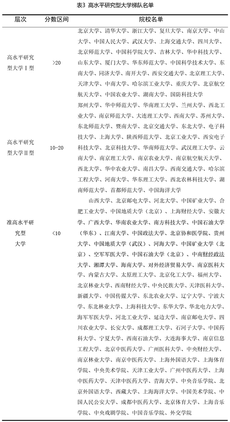 基于綜合得分情況,本文將148所高校劃分為高水平研究型大學I型(31所)、高水平研究型大學Ⅱ型(共計36所)、準高水平研究型大學(共計81所),形成“頂尖引領一中堅支撐—基礎托底”的梯次結構(見表3)。