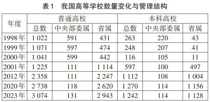 同一時期,即自1999年開始,我國高等教育開始大規模擴大招生,高等學校的數量和高校學生數迅速增加。高等教育的結構隨之發生了歷史性變化。2000年全國普通高校總數1041所,其中中央部門所屬高校599所,省屬高校442所,而到2001年,高校總數1225所,其中中央部門所屬高校只有111所,省屬高校猛增為1114所,成為真正的多數。(見表1)“兩級管理、以省為主”的管理格局成為不可逆轉的態勢。管理體制改革為地方高校的發展創造了有利的制度環境。一方面,管理權下放增強了地方政府發展高等教育的責任感和主動性;另一方面,市場競爭機制的引入促使高校更加注重辦學質量和特色發展;同時社會力量辦學迅猛發展,民辦高校迅速發展。然而,由于區域經濟發展不平衡,地方高校在資源獲取、人才吸引等方面面臨嚴峻挑戰,省域高等教育治理能力和發展水平的不平衡性相當顯著。
