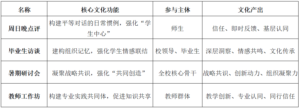 文化賦能機制構成“共同創造”模式的深層支撐,通過系統化的文化建構與制度性交流實踐,營造尊重專業價值、激勵協同創新的組織氛圍。時任校長劉獻君高度重視文化在院校研究中的基礎性作用,提出“共同目標、共同創造、共同發展”的組織文化,在他的推動下,文華學院建立了包括“周日晚點評”、“畢業生深度訪談”等在內的制度性交流體系,為“共同創造”模式提供了深厚的文化支撐。