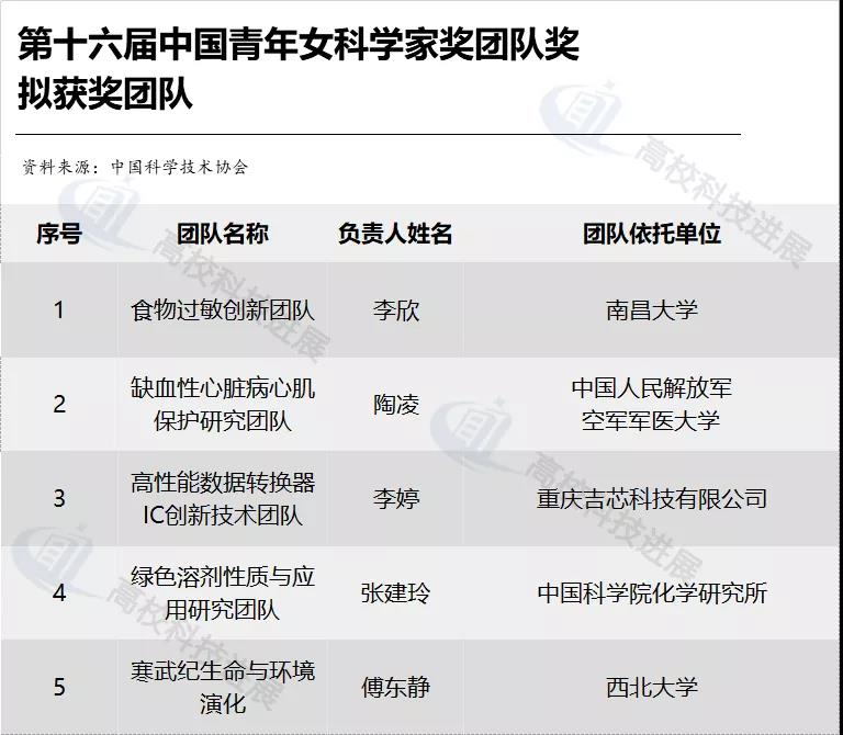 南昌大學、中國人民解放軍空軍軍醫大學和西北大學,各有1個團隊入圍第十六屆“中國青年女科學家獎團隊獎”擬獲獎團隊。擬獲獎團隊分別為:以南昌大學李欣教授為負責人的食物過敏創新團隊、以中國人民解放軍空軍軍醫大學陶凌教授為負責人的缺血性心臟病心肌保護研究團隊、以西北大學傅東靜為負責人的寒武紀生命與環境演化團隊。