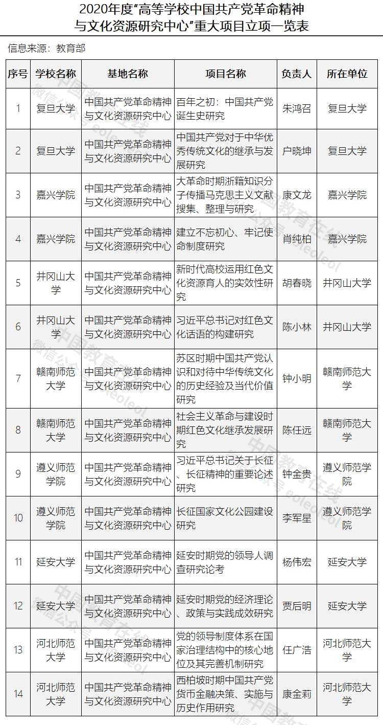 近日,經專家嚴格評審和面向社會公示,14項2020年度“高等學校中國共產黨革命精神與文化資源研究中心”重大項目被批準立項。