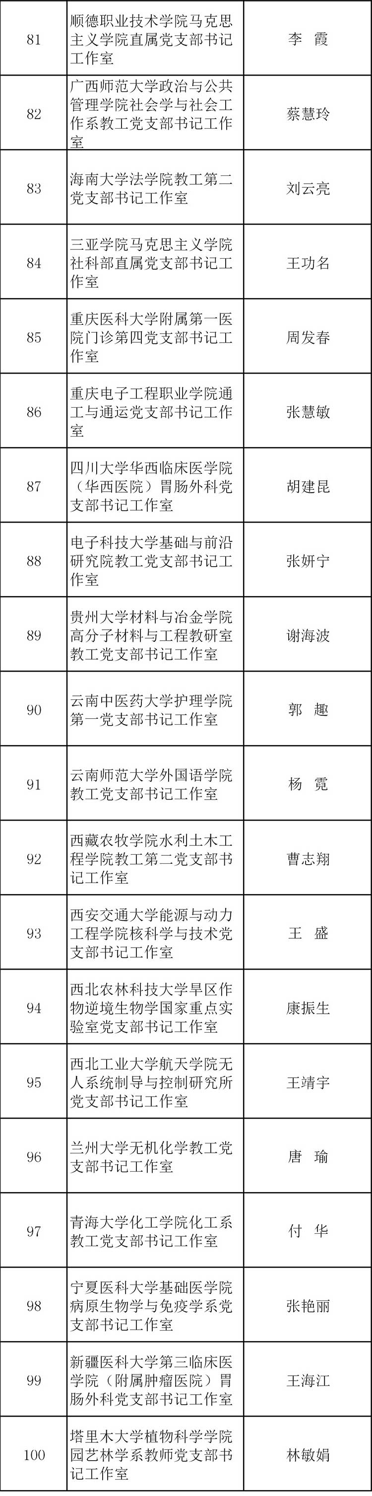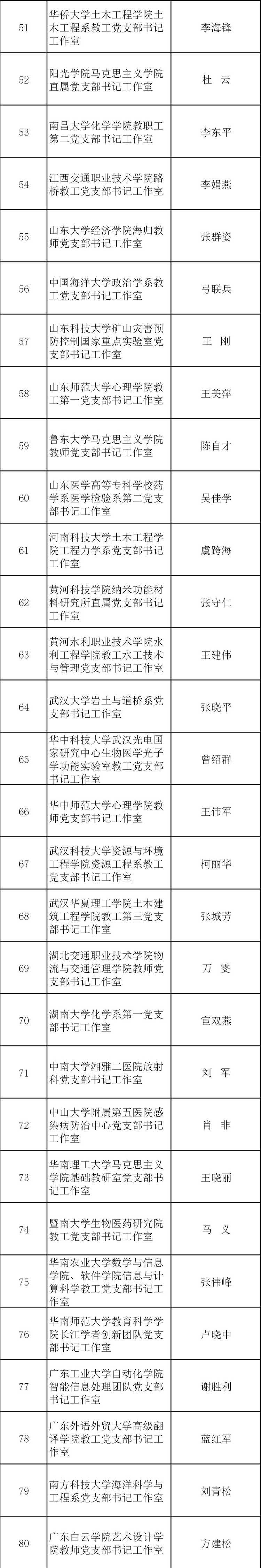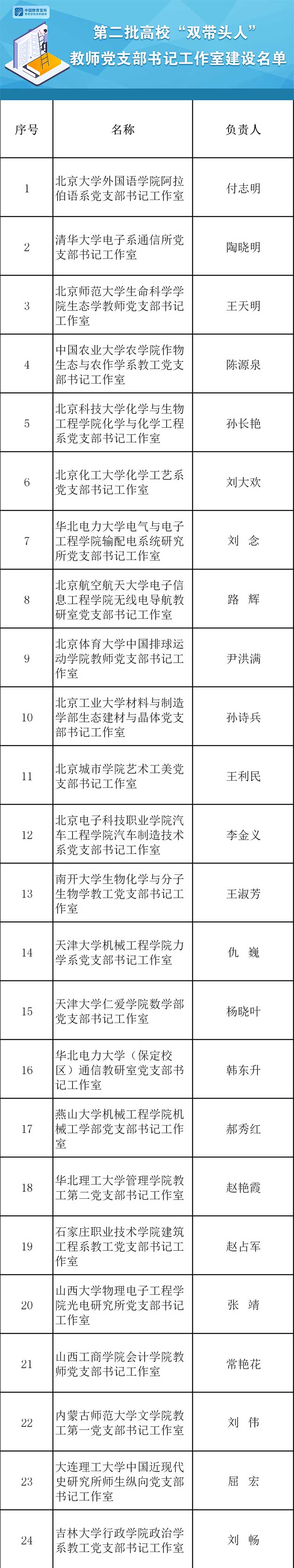 日前,教育部公布第二批高校“雙帶頭人”教師黨支部書記工作室建設名單。名單如下: