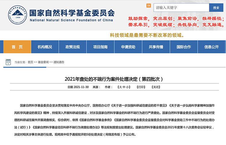 11月30日,國家自然科學基金委員會公布《2021年查處的不端行為案件處理決定(第四批次)》,通報批評5起不端行為案件處理決定(網絡發布版),共有 5 名學者受到處罰。