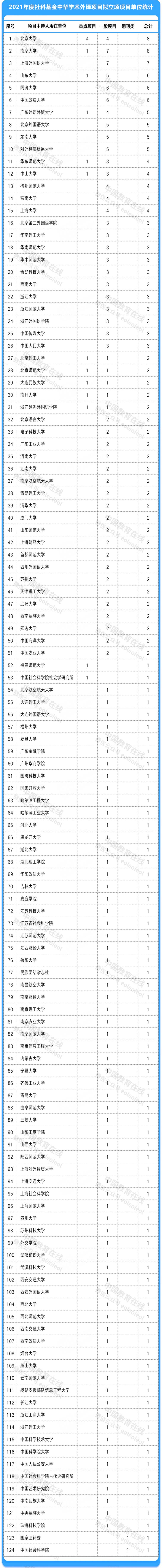 1月24日,全國哲學社會科學工作辦公室公示《2021年度國家社科基金中華學術外譯項目擬立項名單》,共237個項目入選。其中重點項目16個,一般項目219個,期刊類項目2個。根據名單統計,項目主持人單位共124個,其中115個單位為高校。