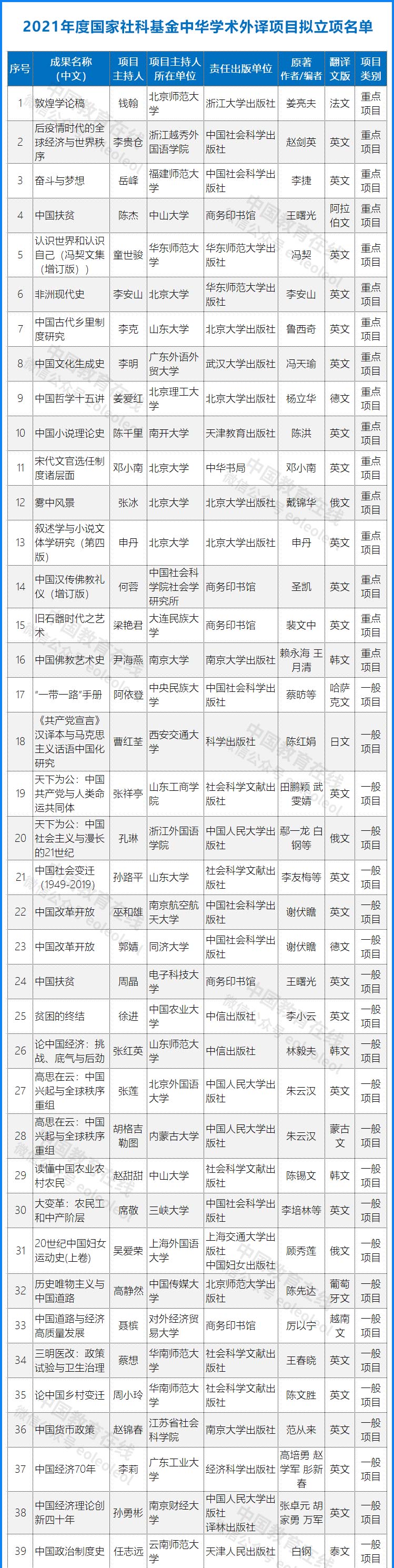 115所高校入選!2021年度國家社科基金中華學術外譯項目擬立項名單公示