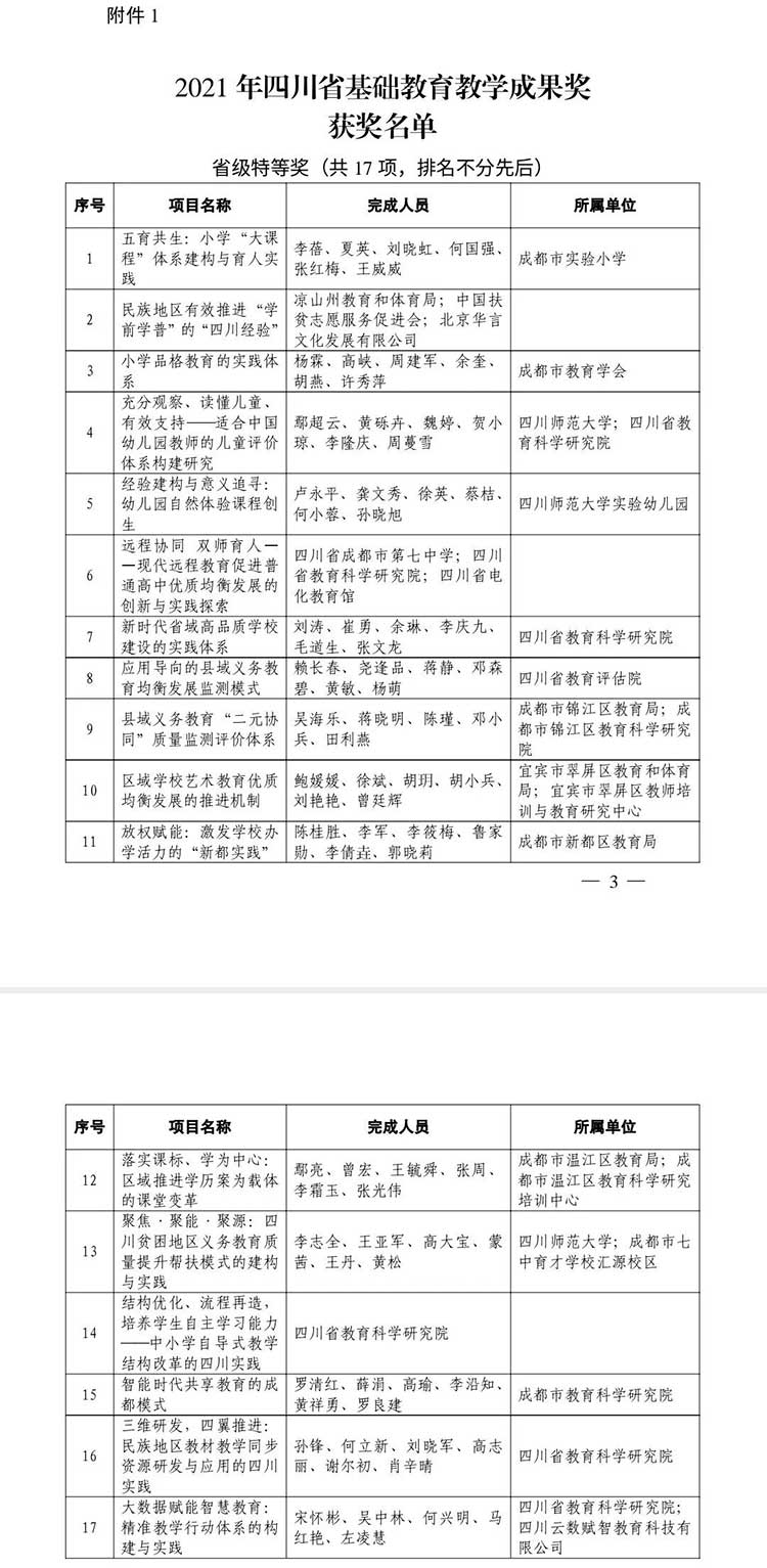 全部獲獎名單:2021年四川省基礎教育教學成果獎獲獎名單