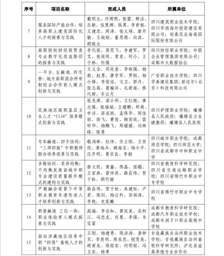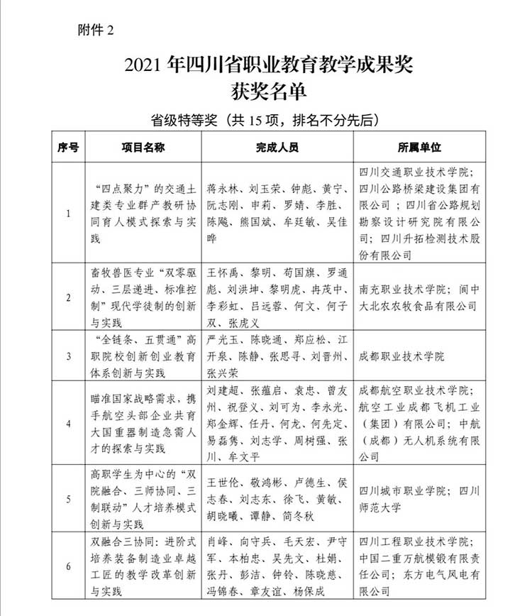 4月11日,四川省政府網站發布《四川省人民政府關于公布2021年四川省教學成果獎的通知》。據悉,為激勵取得教學成果的集體及個人,鼓勵教育工作者從事教育教學研究,不斷提高教學水平和教育質量,根據《教學成果獎勵條例》(中華人民共和國國務院令第151號)和《四川省教學成果獎勵辦法》(四川省人民政府令第92號)規定,經專家評審、社會公示等規定程序,在基礎教育、職業教育、高等教育3個領域共評選出特等獎60項、一等獎260項、二等獎680項。