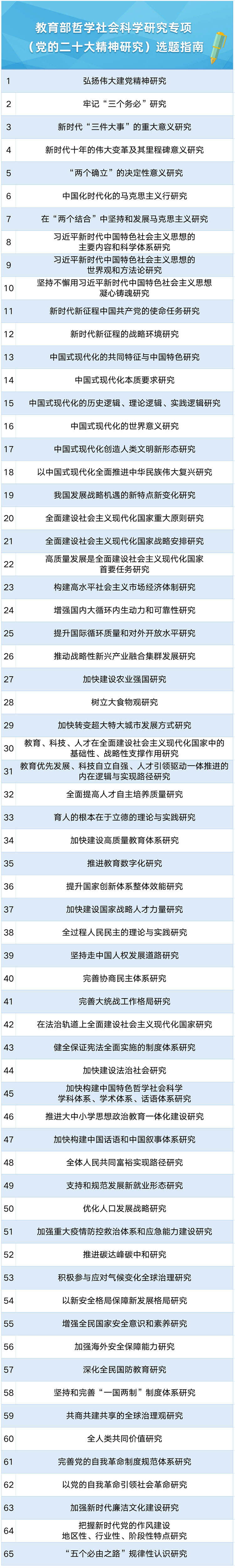 近日,教育部哲學社會科學研究專項(黨的二十大精神研究)選題指南發布,本次共設立65個研究選題指南。