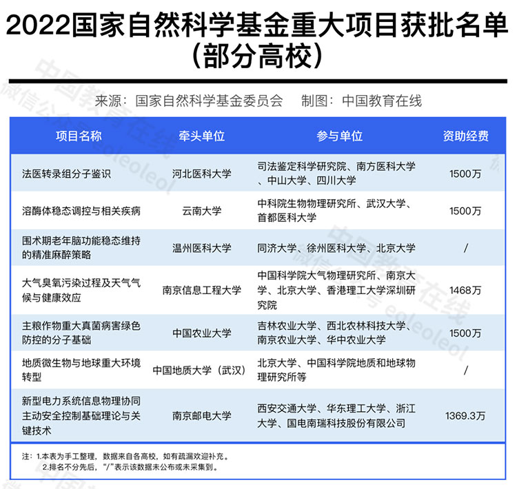 近日,國家自然科學基金委員會公布了2022年重大項目立項信息,河北醫科大學、云南大學、溫州醫科大學、南京信息工程大學、中國農業大學、中國地質大學(武漢)和南京郵電大學等高校相繼官宣獲批這一國家級重大項目。