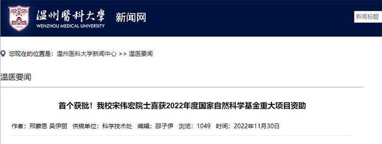 由溫州醫科大學宋偉宏院士和同濟大學熊利澤教授,徐州醫科大學曹君利教授,北京大學王東信教授聯合申報的“圍術期老年腦功能穩態維持的精準麻醉策略”獲國家自然科學基金委重大項目批準立項。該項目為溫州醫科大學首個獲批的國家自然科學基金重大項目,凸顯出學校在老年醫學、腦科學及麻醉學研究領域的原始創新能力的提升。