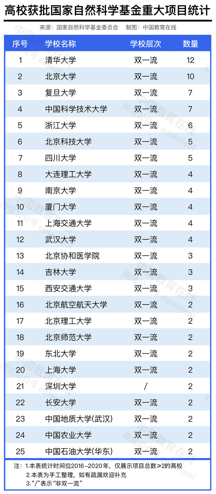 清華大學在2016至2020年共獲批12個自科基金重大項目,位列榜首;北京大學不遑多讓,憑借10個重大項目排在第二,這兩所高校也是5年間唯二斬獲重大項目總數超過10個的高校。