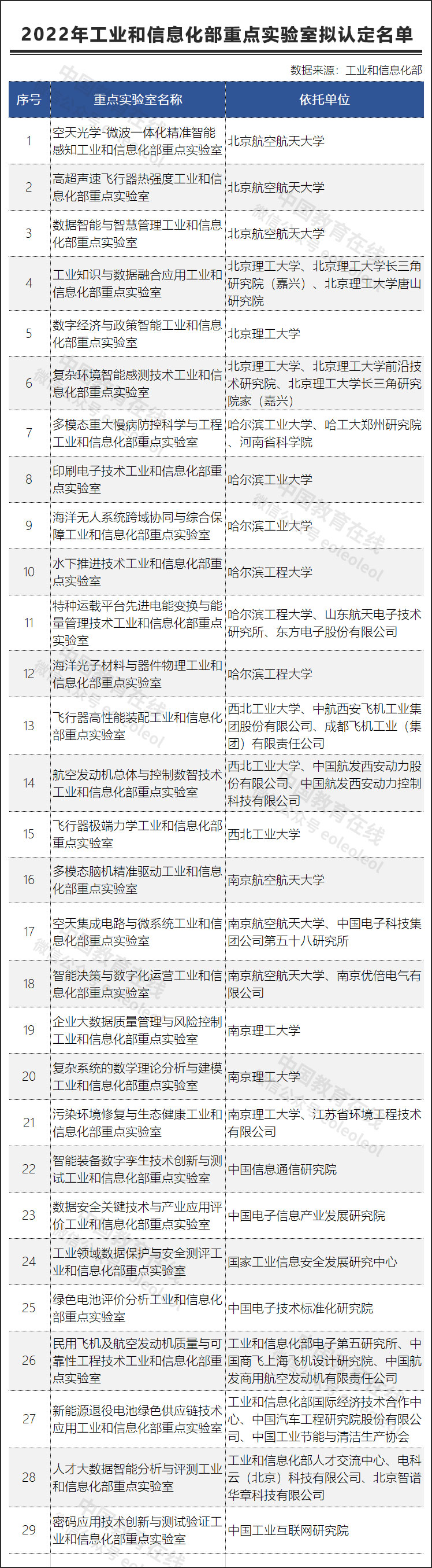 12月2日,2022年工業和信息化部重點實驗室擬認定名單公示,29個重點實驗室入選。其中7所大學為依托單位,且各有3個重點實驗室入選,分別是:北京航空航天大學、北京理工大學、哈爾濱工業大學、哈爾濱工程大學、西北工業大學、南京航空航天大學和南京理工大學。