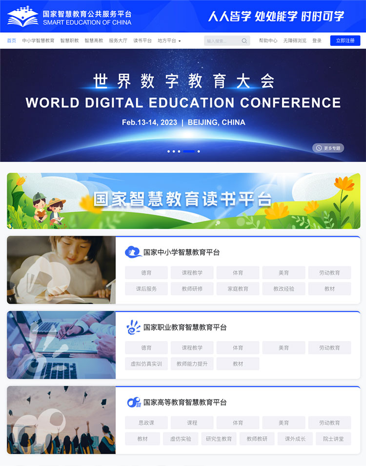 作為數字中國戰略的一部分,推進教育數字化轉型是貫徹國家戰略的應有之義。國家智慧教育公共服務平臺的建設與應用,對推動教育信息化和數字化轉型,提升教育質量和效率,實現優質教育資源的均衡配置,以及建設學習型社會、學習型大國具有深遠的影響。