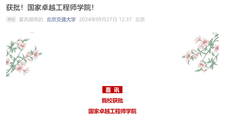 北京交通大學官微9月27日發布消息,學校獲批國家卓越工程師學院!