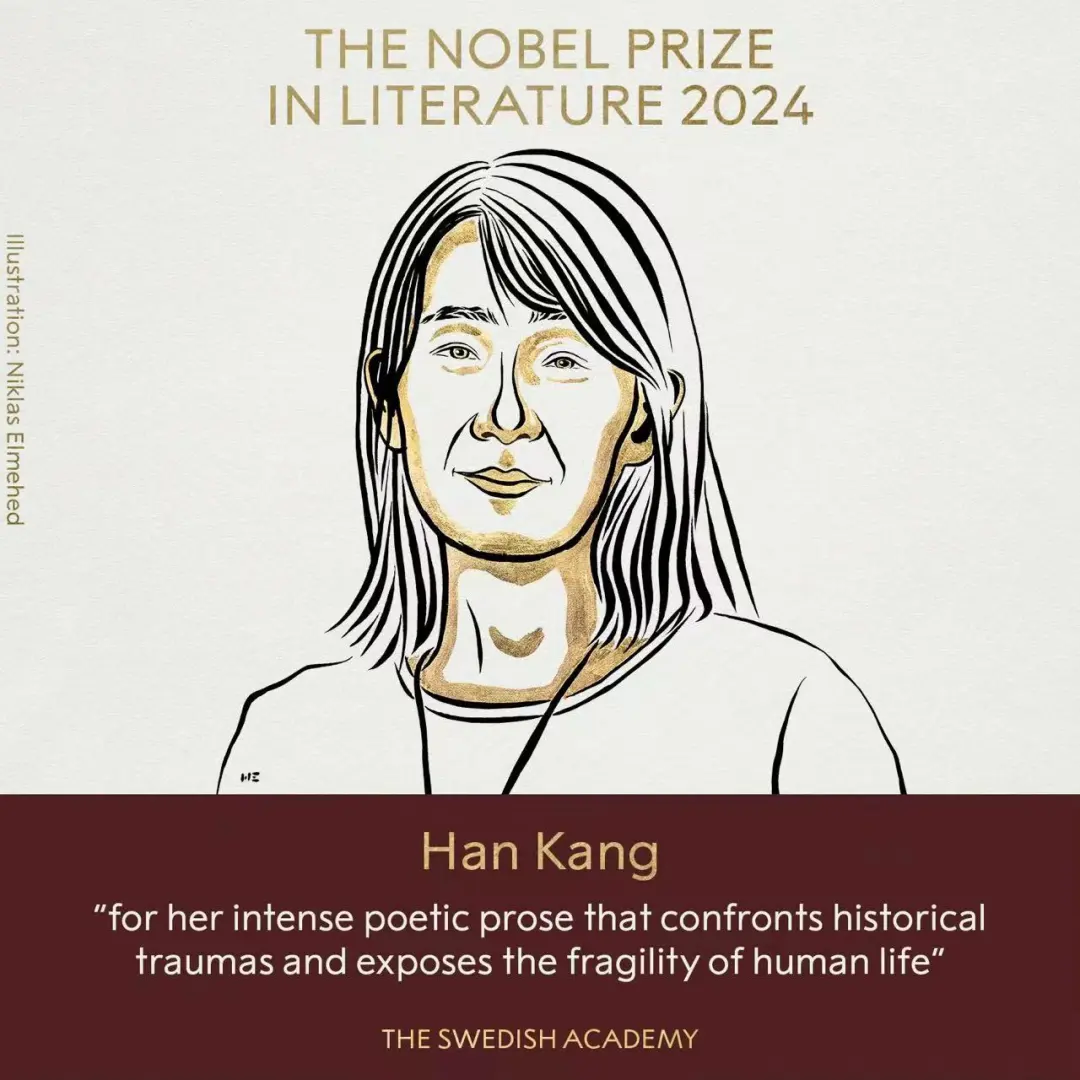 2024年諾貝爾文學獎授予韓國作家韓江“她面對歷史創傷,揭露人類生命脆弱的強烈詩意散文。”