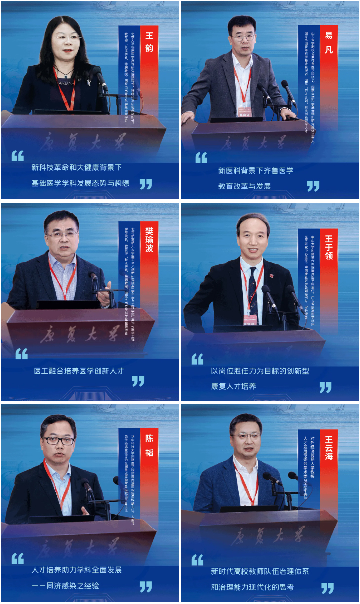在主論壇環節,多位重量級嘉賓就新醫科人才的培養、評價與發展作主題報告。北京大學臨床醫學高等研究院副院長王韻以“新科技革命和大健康背景下基礎醫學學科發展態勢與構想”為題作報告,深入分析了基礎醫學學科在新時代的發展機遇與挑戰。山東大學副校長兼齊魯醫學院院長易凡則分享了“新醫科背景下齊魯醫學教育改革與發展”的實踐經驗,為與會者提供了寶貴的改革思路。北京航空航天大學醫工交叉創新研究院/醫學科學與工程學院/生物與醫學工程學院院長樊瑜波著重討論了醫工融合在培養醫學創新人才中的作用。中山大學附屬第六醫院康復醫學科主任王于領在“以崗位勝任力為目標的創新型康復人才培養”的報告中,強調了崗位勝任力在康復醫學人才培養中的重要性。王于領的報告為康復醫學教育提供了實踐指導。華中科技大學同濟醫學院附屬同濟醫院感染科副主任陳韜分享了“人才培養助力學科全面發展——同濟感染之經驗”,強調人才培養在推動學科發展中的重要作用,并對學科發展的遠景目標進行了規劃。對外經濟貿易大學教授、人才發展專委會學術委員會副主任王云海在“新時代高校教師隊伍治理體系和治理能力現代化的思考”的報告中,探討了高校教師隊伍治理體系的現代化問題。王云海教授的報告為高校教師隊伍建設提供了新思路。