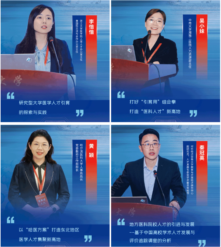在分論壇二中,浙江大學醫學院人事人才辦公室主任兼國際交流與合作辦公室主任李愔愔在“研究型大學醫學人才引育的探索與實踐”的報告中,探討了醫學人才的培養與引進策略。中南大學湘雅二醫院人力資源部主任吳小妹則分享了“打好‘引育用’組合拳,打造‘醫科人才’新高地”的實踐經驗,為醫科人才的引進與發展提供了新思路。哈爾濱醫科大學人事處處長、黨委教師工作部部長黃穎介紹了“以‘哈醫方案’打造東北地區醫學人才集聚新高地”的策略,分享了區域性醫學人才引進的創新模式。對外經濟貿易大學教育與開放經濟研究中心副研究員、人才發展專委會學術委員會秘書秦冠英則基于中國高校學術人才發展與評價追蹤調查,分析了“地方醫科院校人才的引進與發展”,對大學教師的改革、高校人事人才工作提出建議,同時也為地方醫科院校的人才戰略提供了數據支持。