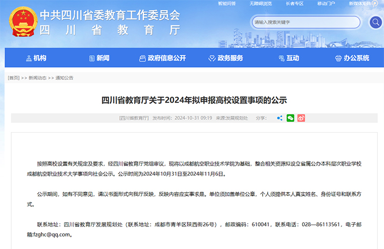 10月31日,四川省教育廳發布公示:擬以成都航空職業技術學院為基礎,整合相關資源設立省屬公辦本科層次職業學校成都航空職業技術大學。