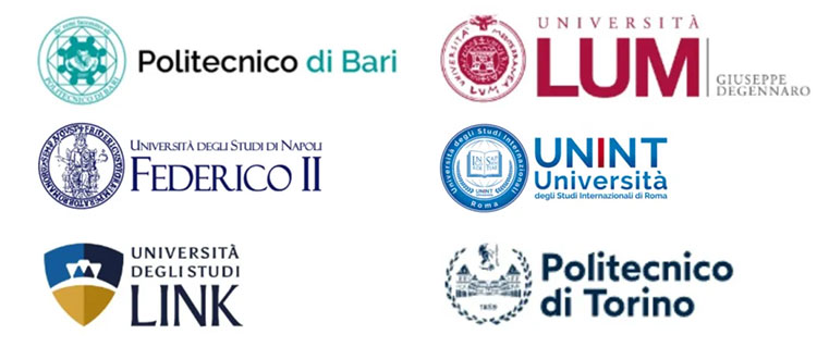 巴里LUM大學、巴里理工大學、貝加莫大學、博洛尼亞大學、都靈大學、都靈理工大學、卡拉布里亞大學、卡梅里諾大學、羅馬Link校園大學、羅馬國際研究大學、羅馬第一大學、馬切拉塔大學、米蘭理工大學、那不勒斯東方大學、那不勒斯費德里科二世大學、那不勒斯“帕特諾普”大學、佩魯賈外國人大學、帕多瓦大學、薩倫托大學、圖西亞大學、威尼斯大學、錫耶納大學