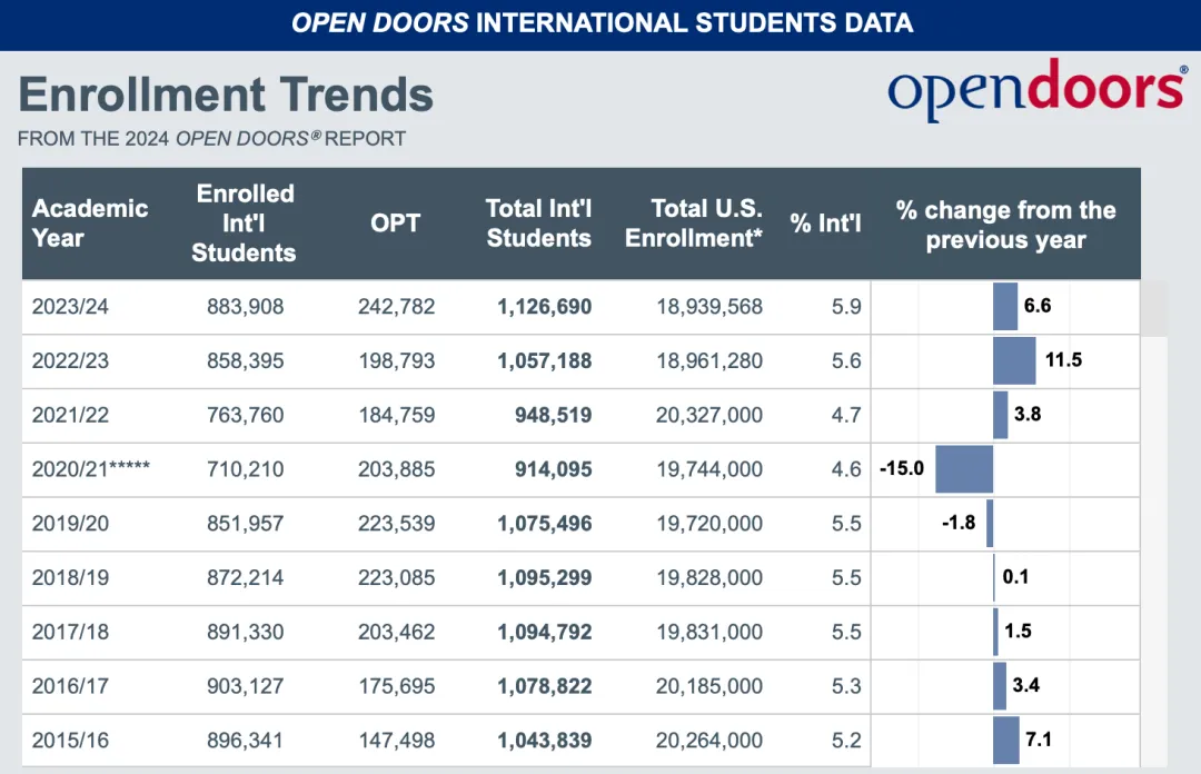 根據Open Doors 2024最新數據,2023/2024學年在美國留學的國際學生數量達1126690人,同比增長6.6%,創造歷史最高紀錄。