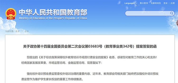 近日,教育部網站發布“對第十四屆全國委員會第二次會議第03683號提案的答復”,在答復“關于綜合施策保障校外教育培訓市場預付費安全的提案”時,教育部表示,用好“黑白名單”制度,將培訓預收費情況作為校外培訓機構誠信建設的重要內容,依法依規嚴厲懲治違法失信行為,著力防范化解風險,切實維護人民群眾的合法權益。