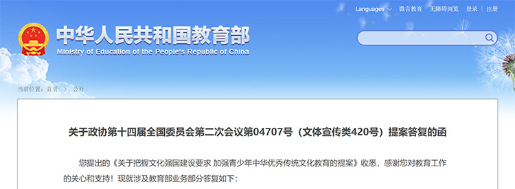近日,教育部網站發布“關于政協第十四屆全國委員會第二次會議第04707號(文體宣傳類420號)提案答復的函”,就“關于把握文化強國建設要求 加強青少年中華優秀傳統文化教育的提案”作出答復。教育部表示,將圍繞落實立德樹人根本任務,推動中小學中華優秀傳統文化教育常態實施,實現利用中華優秀傳統文化鑄魂育人的長效化、制度化。