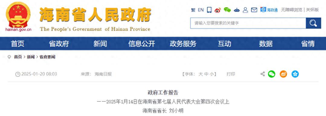 1月14日,海南省第七屆人民代表大會第四次會議在海口開幕,海南省省長劉小明代表省政府向大會作政府工作報告。