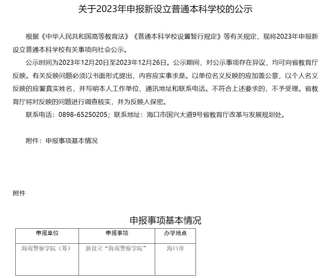 2023年12月20日,海南省教育廳發布《關于2023年申報新設立普通本科學校的公示》,申報新設立“海南警察學院”,辦學地點在海口市。