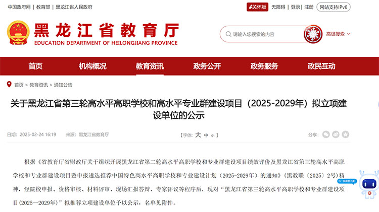 2月24日,黑龍江省教育廳發布《關于黑龍江省第三輪高水平高職學校和高水平專業群建設項目(2025-2029年)擬立項建設單位的公示》。