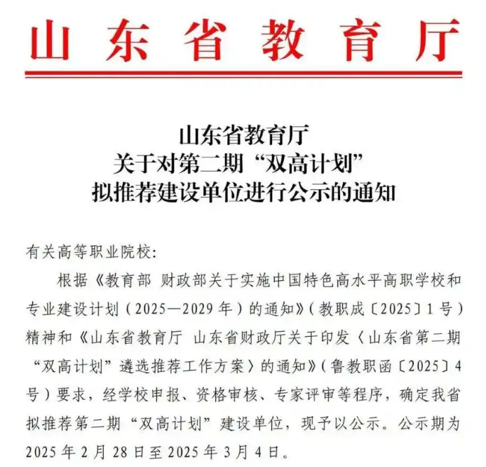近日,山東省教育廳發布《關于對第二期“雙高計劃”擬推薦建設單位進行公示的通知》,擬推薦16所院校進行第二期“雙高計劃”建設,公示期為2025年2月28日至2025年3月4日。
