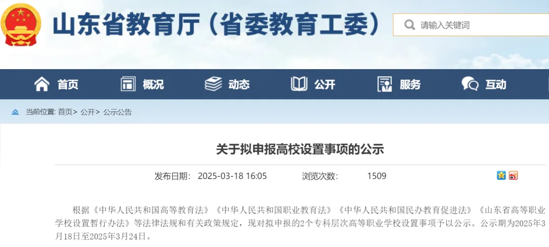 根據《中華人民共和國高等教育法》《中華人民共和國職業教育法》《中華人民共和國民辦教育促進法》《山東省高等職業學校設置暫行辦法》等法律法規和有關政策規定,現對擬申報的2個專科層次高等職業學校設置事項予以公示。公示期為2025年3 月18日至2025年3月24日。
